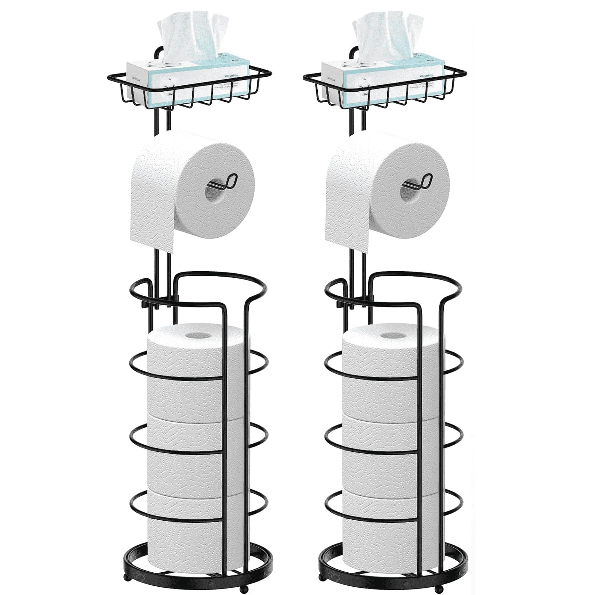 2 Pack Toilet Paper Holder, Free Standing Toilet Roll Holder No Drilling, Bathroom Toilet Paper Stand with Shelf Organizers and Storage, Upgraded