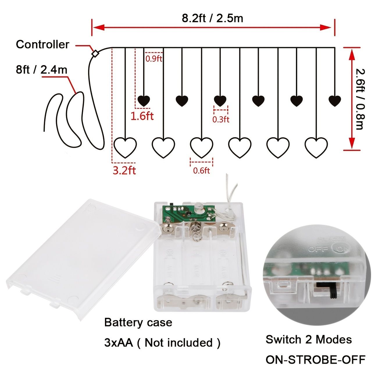Heart Shape Light(Warm White)Material: strong copper wire LED Type:138 led lights in total. There are 12 heart pendants. The small heart have 10 cm in diameter and the droop lengths 60cm; the larger heart has 20cm in diameter and the strip length is 90cm. Lighting mode:8 flash mode: Combination;  Waves;  Sequential;  Slo-glo;  Chasing/Flash;  Slow Fade;  Twinkle/Flash;  Steady On Power: 3*AA(Exclude) or Insert USB interface. Whether indoor or outdoor;  you can choose any method conveniently.